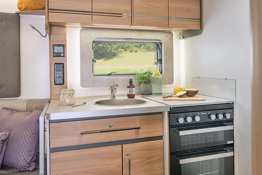 The Adamo 69-4 comes with a fully-equipped kitchen featuring a Thetford ‘K-Series’ combination oven, grill and dual-fuel hob and Thetford 142 litre tower refrigerator