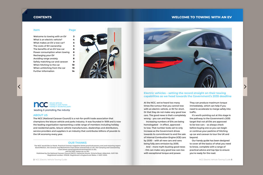 The NCC have produced an electric vehicle towing guide with information about the types of electric cars available, how an electric car is approved for towing, how to hitch up, and tips for stress-free touring.