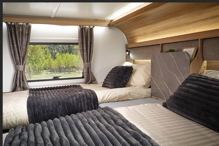 - Raised rear twin single beds, which can also convert into a double bed, with underbed storage and interior access to the garage