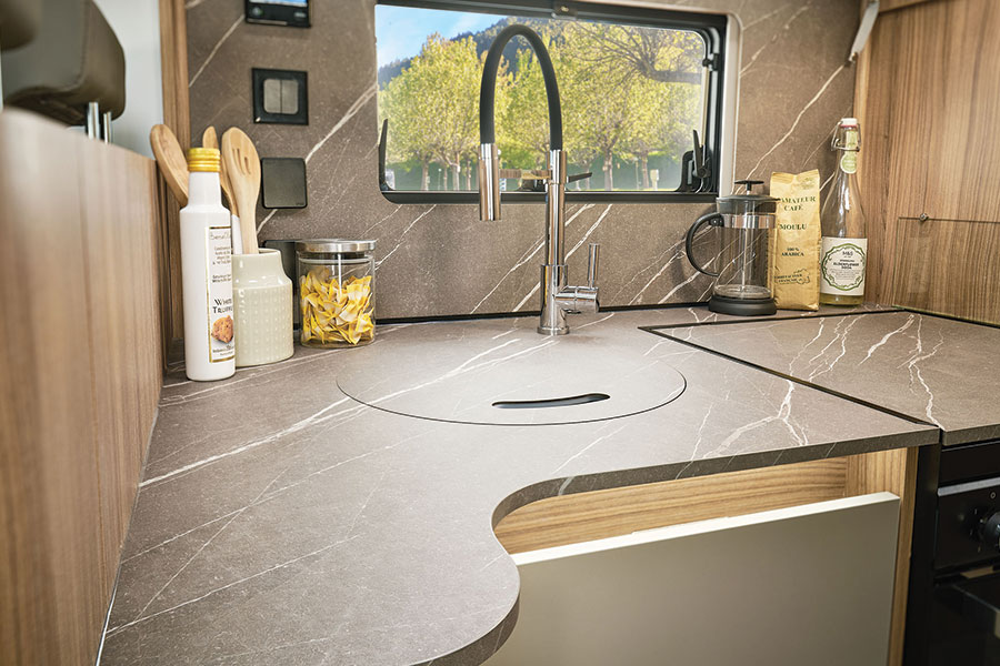 - Fully equipped kitchen with Thetford 137L absorption tower fridge