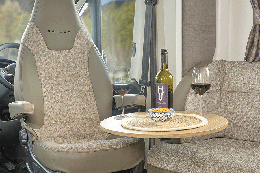 • Bailey ‘Natural Oak’ curved overhead locker doors with ‘Pearl Bronze’ detailing and positive door catches for secure storage in transit