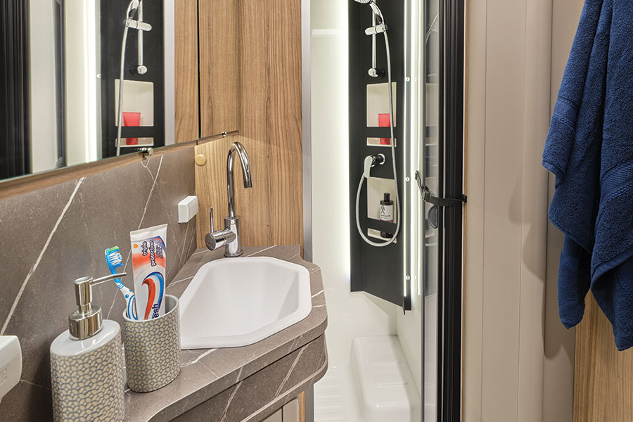 • Onboard shower with fitted shower tray including twin drainage points, Ecocamel shower head, riser bar and combination mixer tap