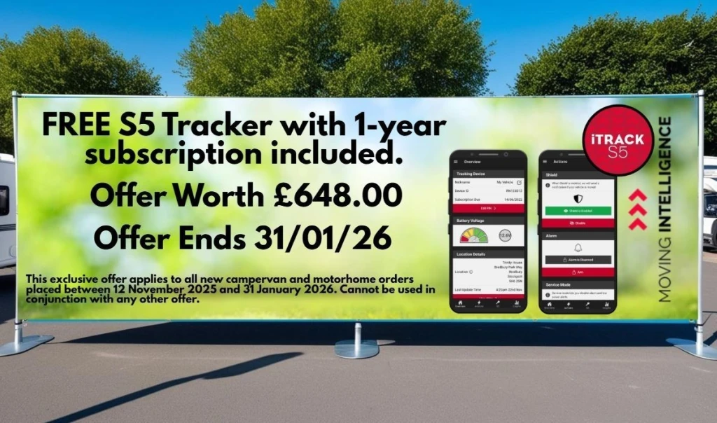 Free S5 tracker with 1 year subscription worth £648 when ordering a new Bailey Campervan (Endeavour & Endurance) or Motorhome (Autograph & Adamo)
