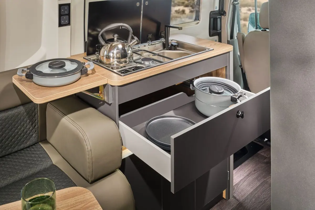 Heki rooflights and flush-fit double-glazed windows flood the living space with natural light, while nearly 2 metres of internal headroom ensures the interior feels open and spacious. The fully equipped kitchen features Bailey ‘Lunar Grey’ units, a 90-litre compressor refrigerator, combination hob and sink, and a drop-down worktop extension for added preparation space.