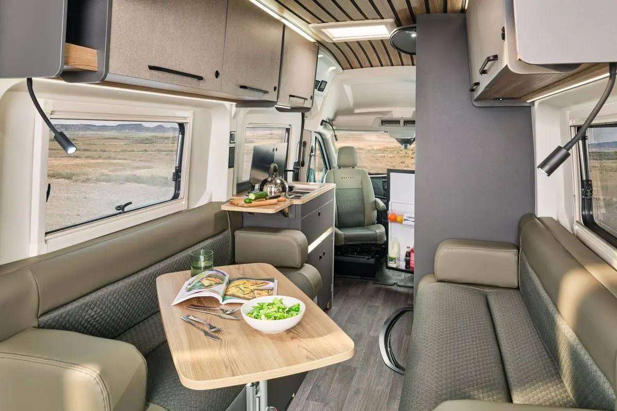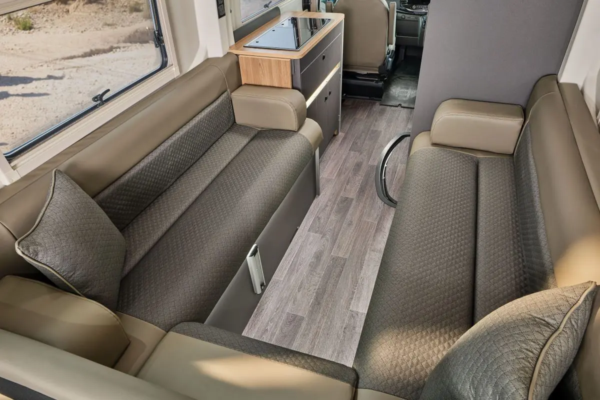 The washroom incorporates a revolving tambour partition, onboard shower, countertop basin and Thetford electric flush toilet, maximising usable space throughout the vehicle. The rear of the vehicle features an open and flexible lounge area with a multi-position table and dedicated storage, providing a spacious environment during the day and transforming into a large double bed at night.