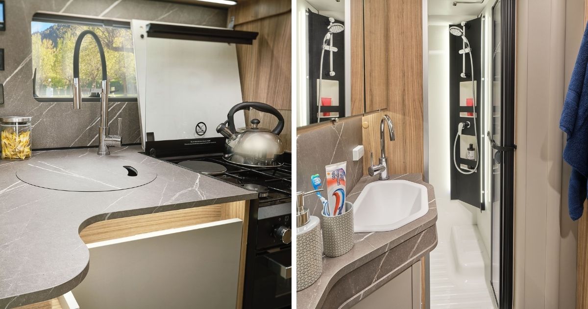 - Fully equipped kitchens with Thetford 137L absorption tower fridge