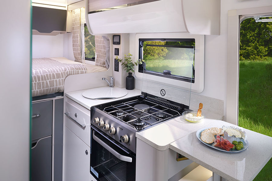 - Full ovens, grills, and 3-ring gas hobs with an electric plate, so you have versions of everything you’d have at home, meaning you can cook pretty much anything you’d like to. Many people successfully cook roast dinners in their motorhome and many also bake