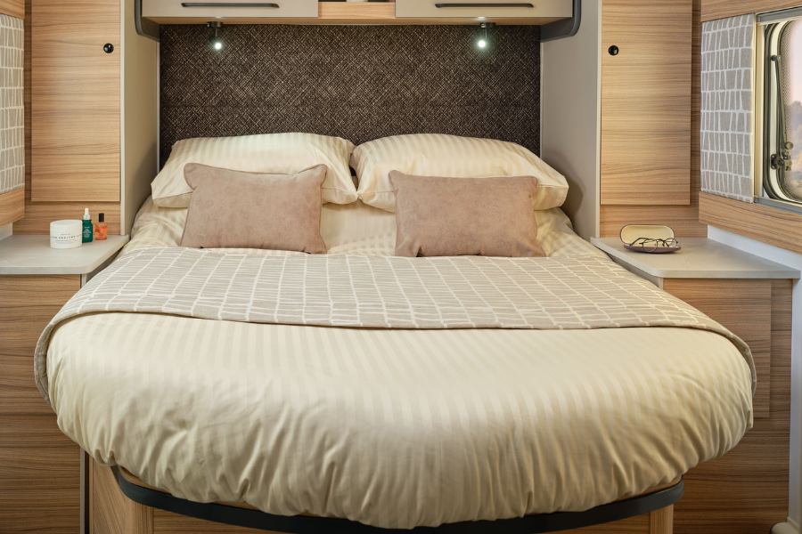 - Front lounge with wall-mounted TV station (TV available as a cost upgrade), converts to a double bed, available in three fabric options