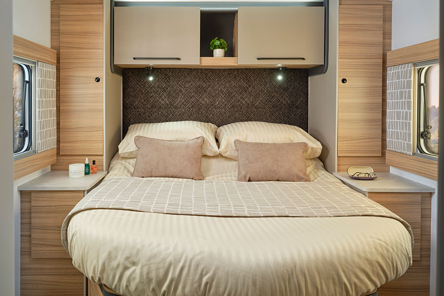 - Front lounge converts to twin singles or a double bed, available in three fabric options