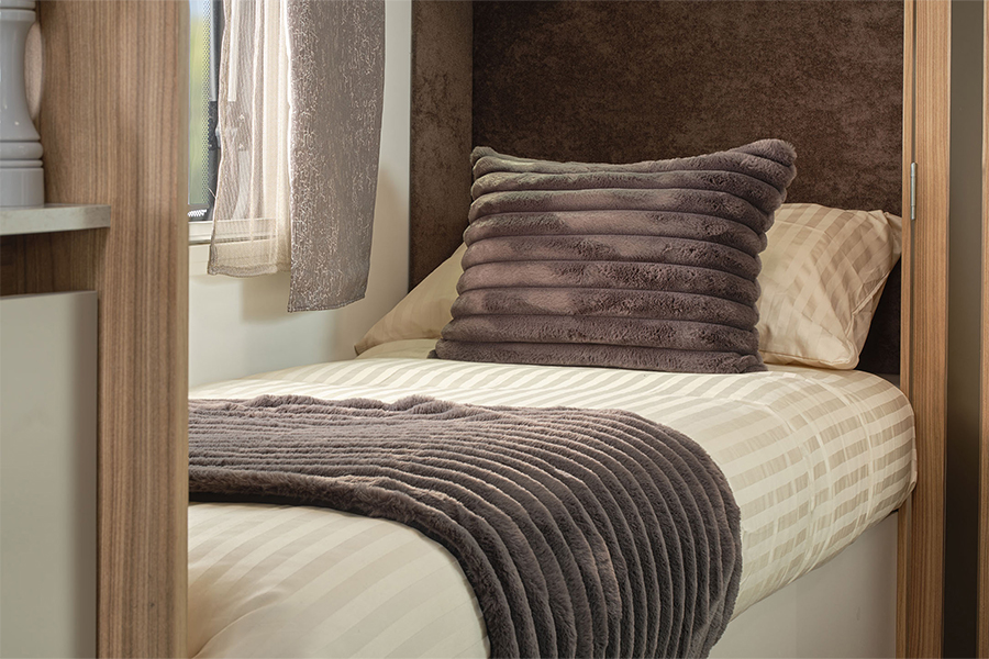 • Optional ‘Jasmine’ soft furnishings with practical Aquaclean fabric, co-ordinating curtain panels, up to four bolster cushions and four scatter cushions